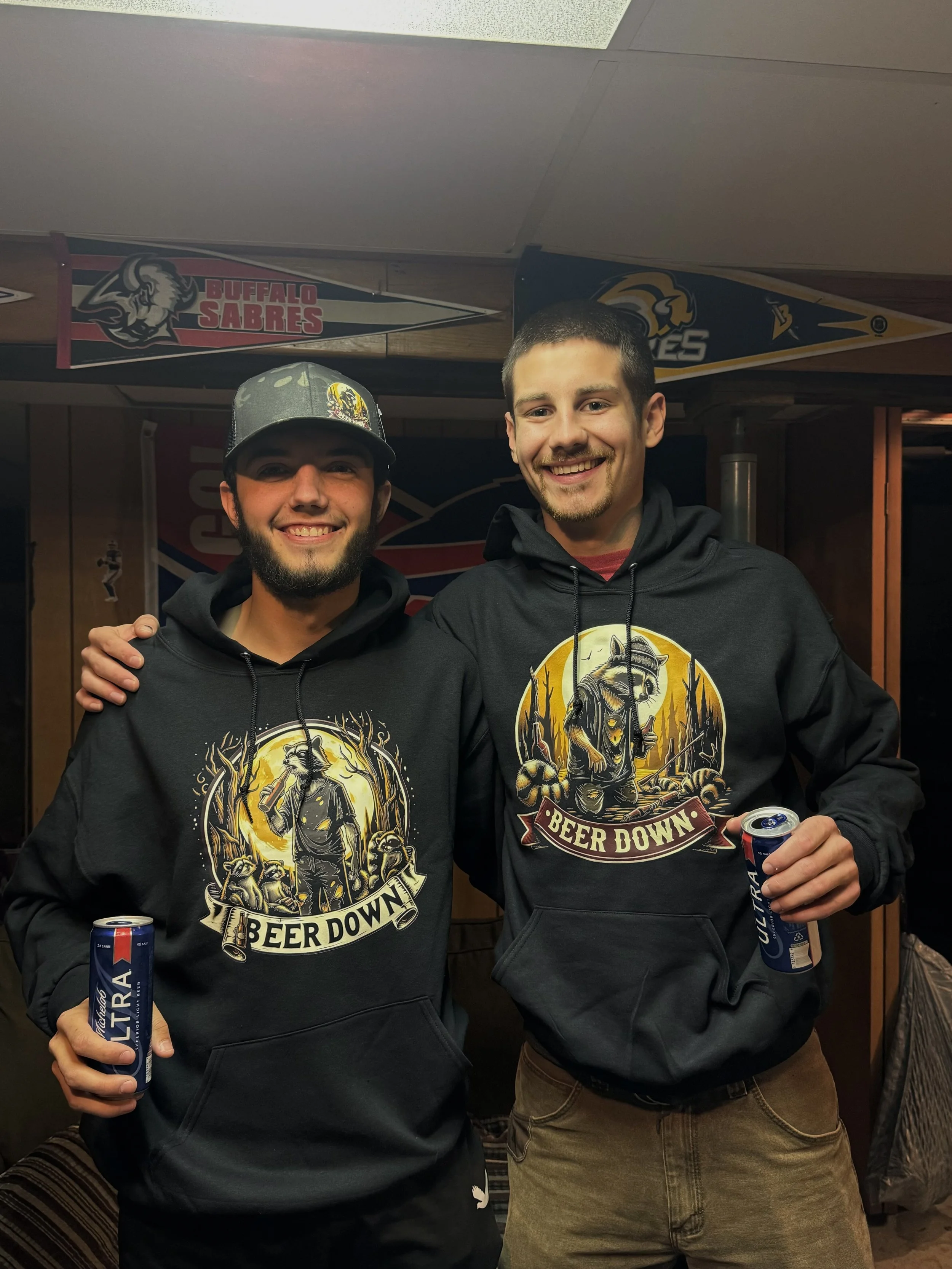 After 15 years of friendship and countless unforgettable memories, two best friends decided to turn their shared passion for beer into a clothing brand. Inspired by many lively nights out, where beers were spilled and savored, we developed the tradition of raising our cans together and shouting, "BEER DOWN!" – a spontaneous celebration that would become the foundation of our brand. The raccoon design, a signature element of our identity, was born one night when we witnessed a curious raccoon playfully toying with a beer bottle during one of our adventures, perfectly capturing the playful spirit we wanted to share with the world.